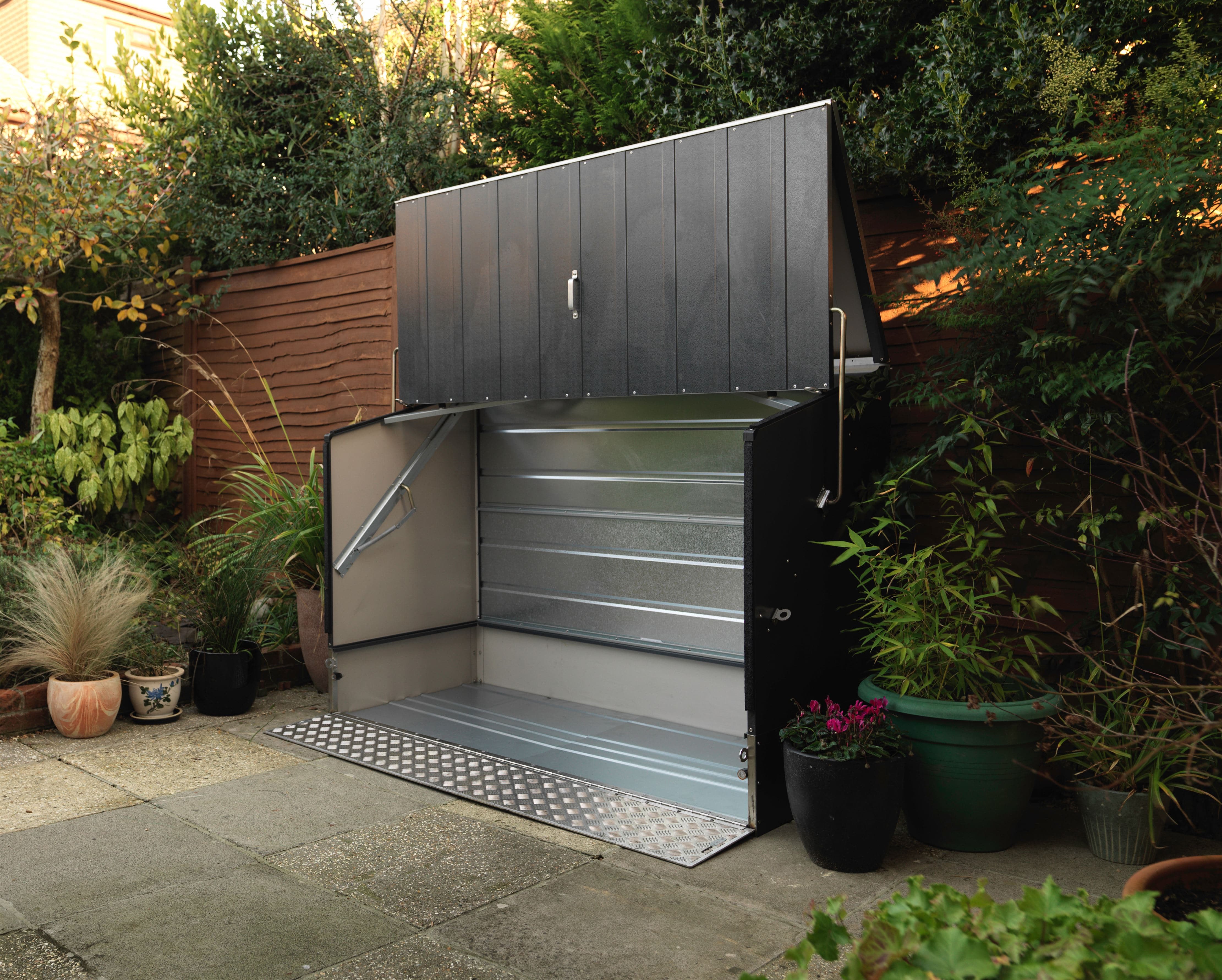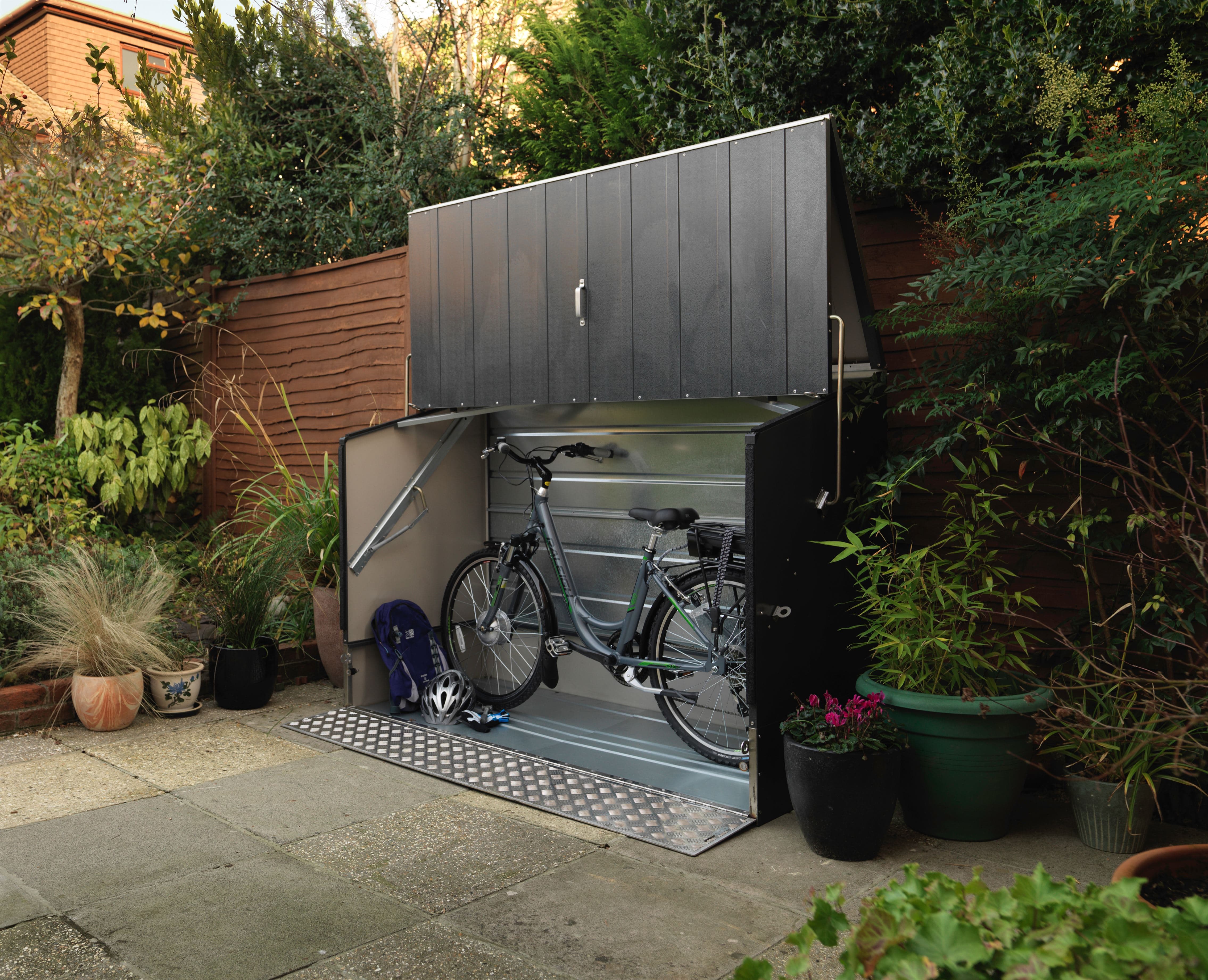 The Trimetals Bicycle Store is a great value, compact all-metal general-purpose bike storage unit which provides secure, tidy and convenient storage for up to three adult bikes and all your general cycling equipment. This upgraded version features a hinged front ramp which provides enhanced accessibility to your bikes and is particularly helpful when storing heavier electric bikes. The Bicycle Store has been tested and featured by a number of leading UK cycling magazines including Cycling Weekly, Cycling World and Mountain Biking UK, the latter describing it as “a superb product and best available for the money”.