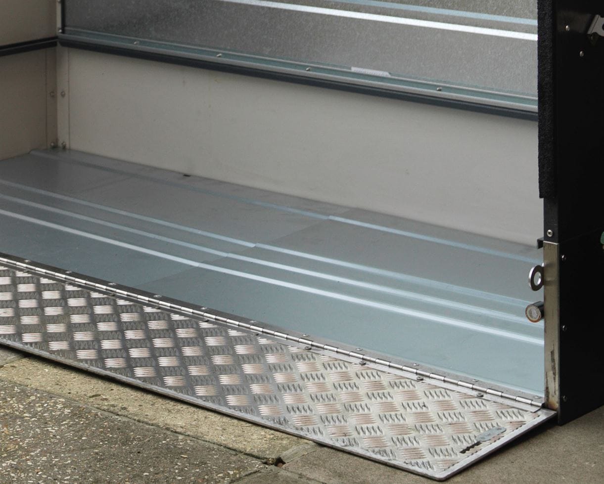 The Trimetals Bicycle Store features a clever spring-assisted opening action that makes opening and closing of its concertina-style door exceptionally smooth as well as a hinged front ramp that allows easy and complete “walk-in” access to your bikes. The clever patented front ramp design simply drops down when access to your bikes is needed and then folds back into position to form the front lower base of the unit when closed. Reinforced metal hinges are incorporated along the length of the ramp which is designed to support the weight of a cyclist and a bicycle. The access ramp does not reduce the storage space within the unit. The unit is supplied in a convenient flat pack and is very simple to construct, with all major components being supplied pre-assembled including the door and roof. The unit comes with easy-to-follow illustrated assembly instructions and all necessary fixings. Trimetals recommends assembly of the unit is undertaken by a minimum of two people.