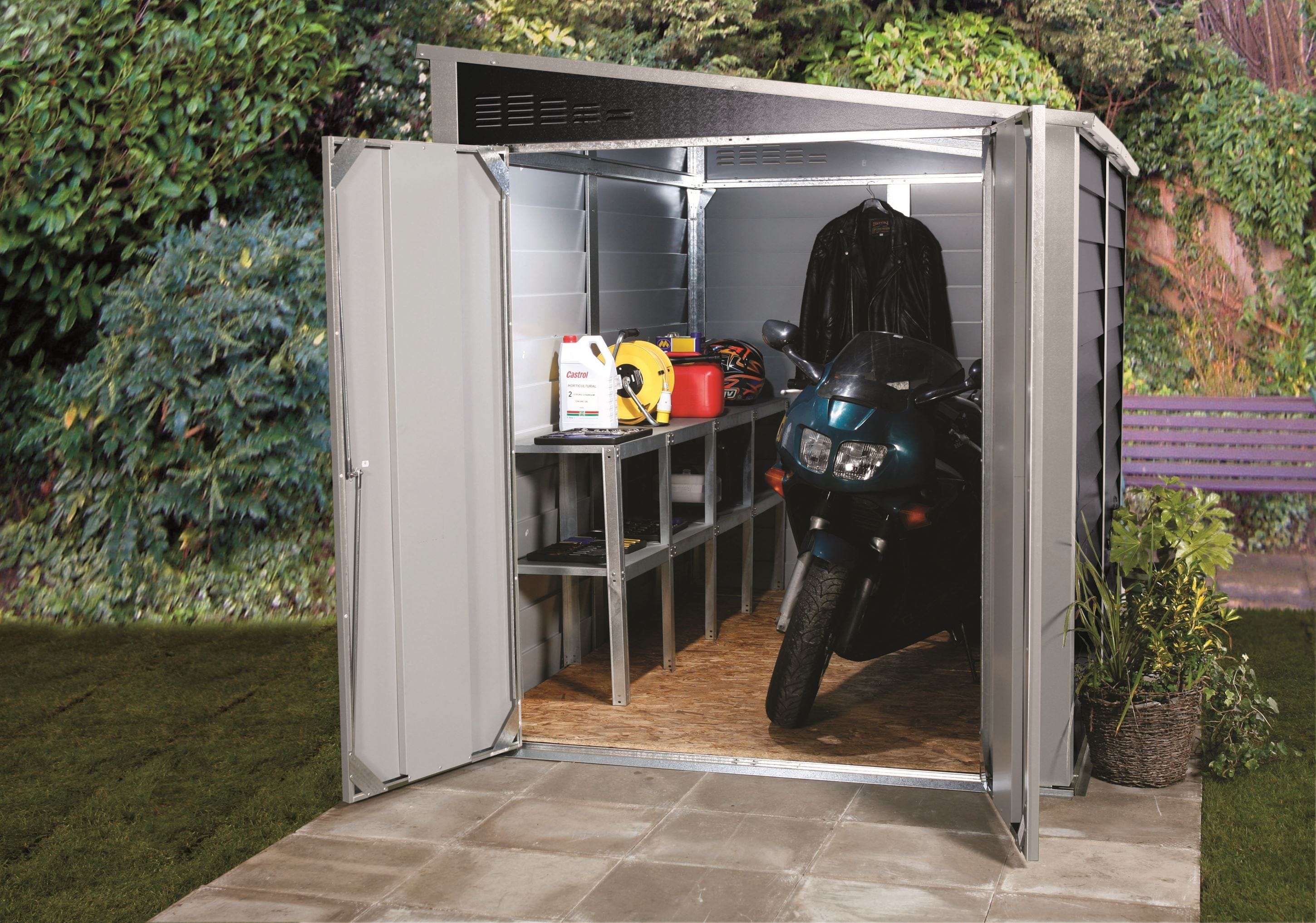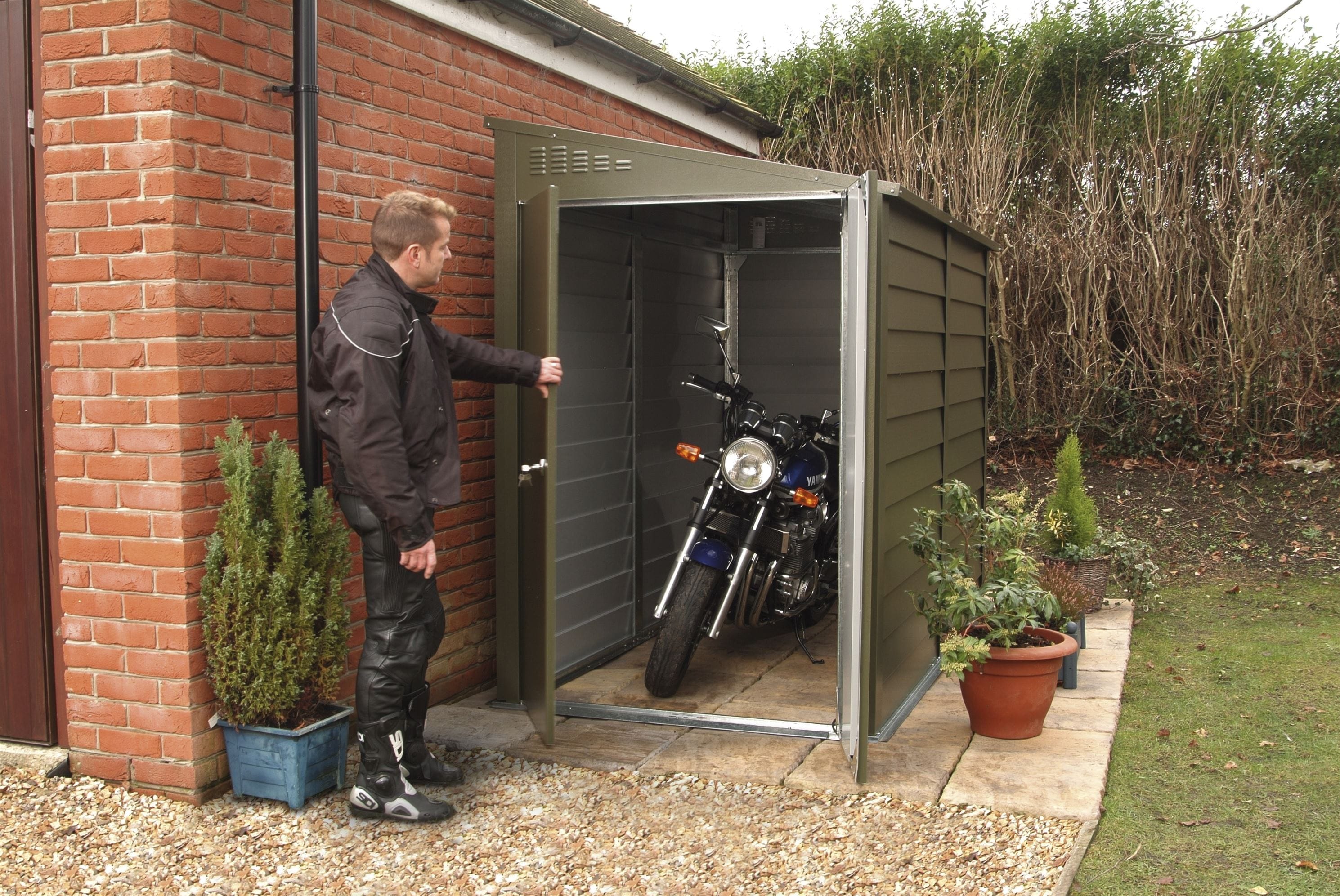 Trimetals MCG 940 Motorcycle Garage is a large, high quality, maintenance-free all-metal motorcycle garage which provides an affordable, secure and convenient storage solution for your valuable motorcycle and riding accessories, keeping them safe from theft and vandalism, and protected from the elements. The MCG 940 is the smallest of Trimetals’ standard motorcycle garages, measuring 1460mm in width (4’8”) x 2775mm in depth (9’1”) and designed to store one full-size motorcycle. Trimetals standard motorcycle garages are available in three sizes, with the largest (MCG 960) being designed to store two machines side by side. The MCG 950 and 960 models are also available from My Secure Garden. Trimetals motorcycle garages have been featured and “recommended” by several UK motorcycle magazines including Bike Magazine, Ride Magazine, Motorcycle Sport and Leisure and Performance Bikes Magazine. Discounted insurance may also be offered by some insurers and brokers for motorcycles that are stored in Trimetals motorcycle garages. Trimetals MCG motorcycle garages can be customised with a range of optional extras to maximise the storage capacity and security of the units.