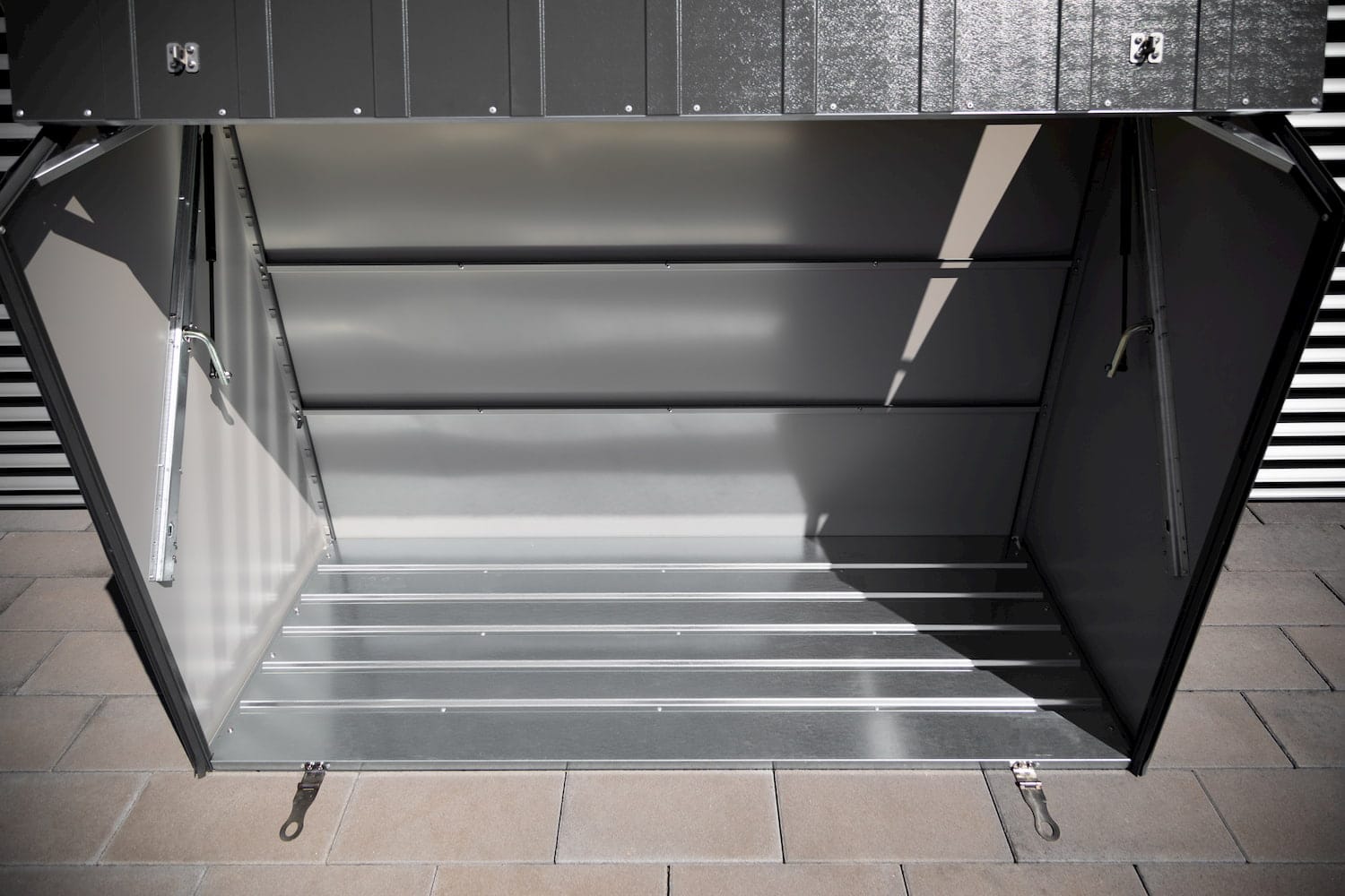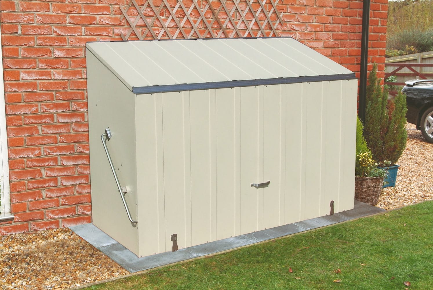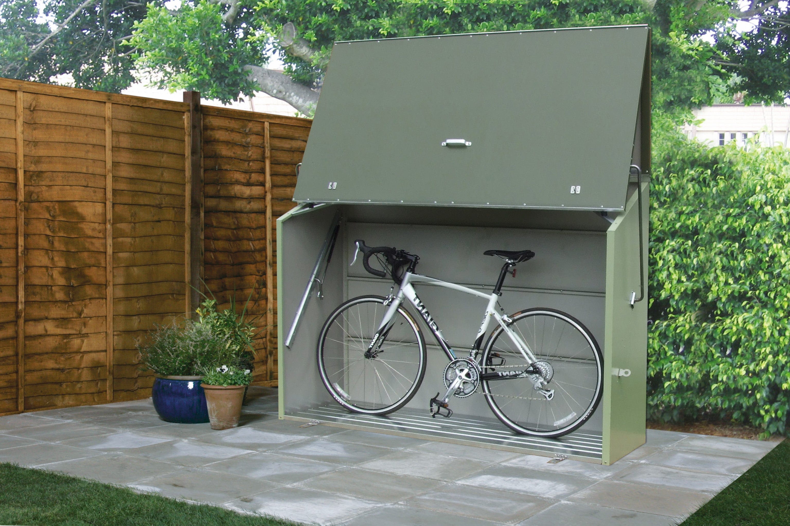 The Sesame is manufactured in the UK using PVC coated galvanised steel which is fire-resistant, maintenance fee and guaranteed for 25 years. The unit’s all-metal construction makes it strong, secure and highly durable, and unlike plastic or wooden sheds it will not warp, become weak and brittle or crack and discolour over time, even in coastal locations. The Sesame comes fitted with a reinforced metal floor as standard, as well as two stainless steel hasp and staples which lock the front door to the base, and two secure padlock points on the sides. The unit also has a very low lip or threshold at the front making it simple and straightforward to store and access heavy and bulky items and enabling a bike to be wheeled straight inside. The unit is designed to be bolted down from the inside to a hard surface, enabling your valuable garden items or bike to be securely locked away and protected from theft as well as the elements.