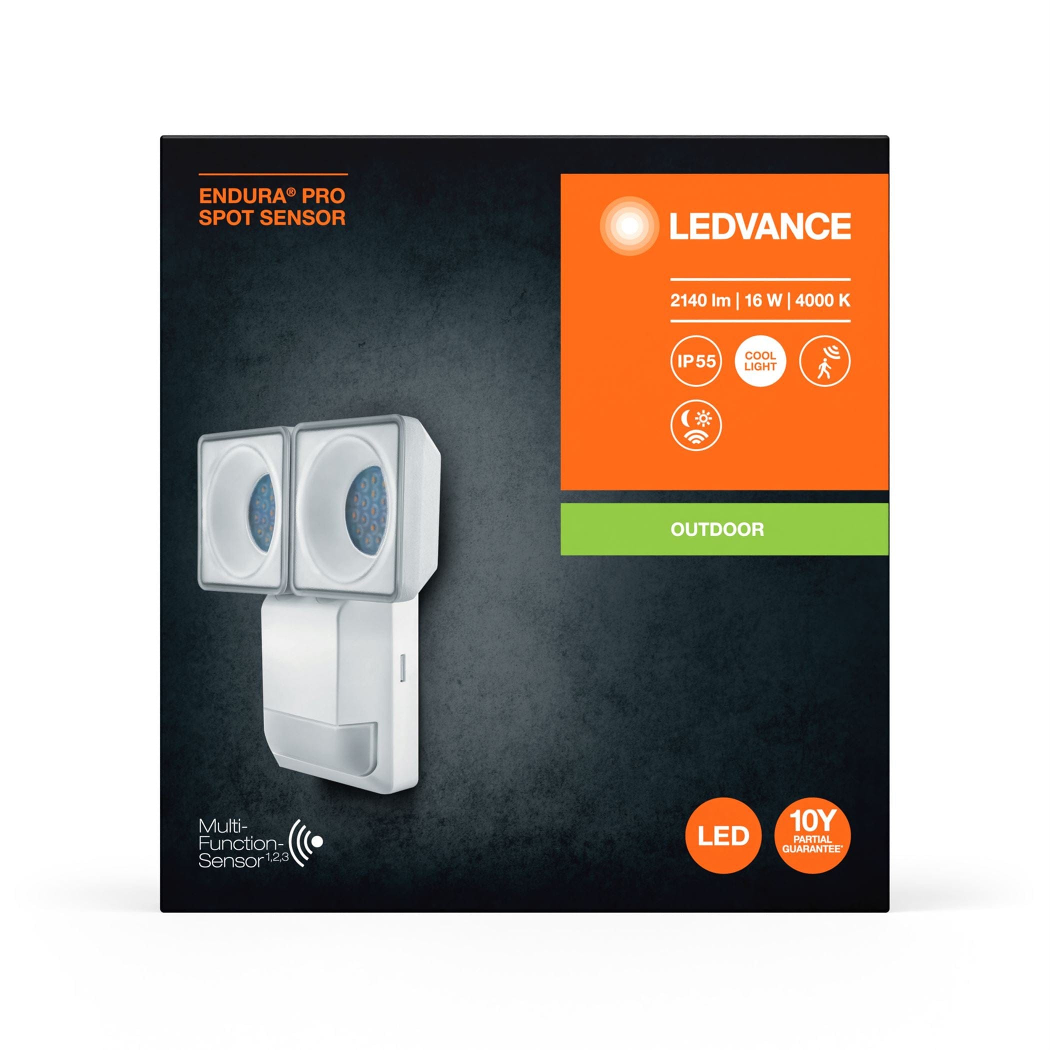The Ledvance Endura® Pro Spot Sensor 16W (4000k cool white light) is a compact LED outdoor spotlight with multi-function motion/light sensor and four light setting options which can be used to illuminate and help improve security in a variety of outdoor areas including entrances, gardens, outbuildings and passageways.