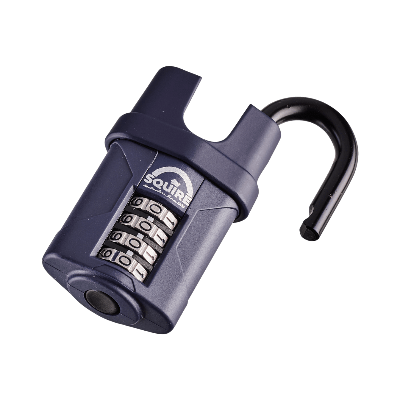 A blue Squire CP40CS heavy-duty closed-shackle combination padlock with its 6mm hardened steel shackle open and its 4-wheel recodable mechanism on the front, suitable for a range of garden and outdoor security applications.