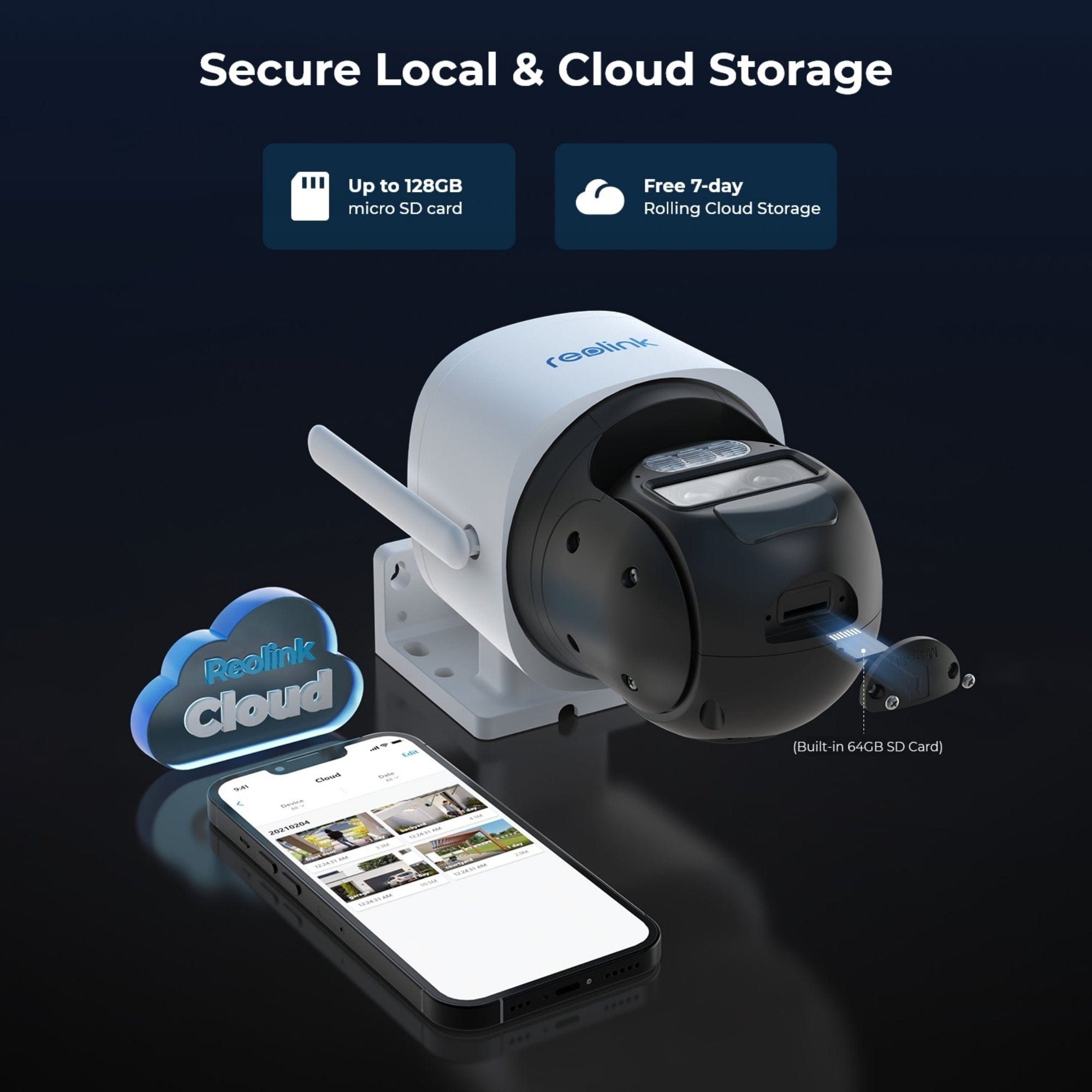Storage/Recording | Supports up to 128GB micro-SD card 64GB micro-SD card included with kit Supports Reolink Cloud |